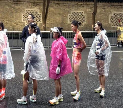 精英熱身區(qū)里,朱卿、黃菲、潘素芳、李春霞等十位特邀精英穿著羽絨服,來回折返做著賽前的熱身跑以及動態(tài)的熱身訓(xùn)練。存衣完畢后,她們換上背心短褲披上雨衣,在等待身份檢驗的間隙不斷活動著身體以保證剛熱身開的肌肉保持彈性。