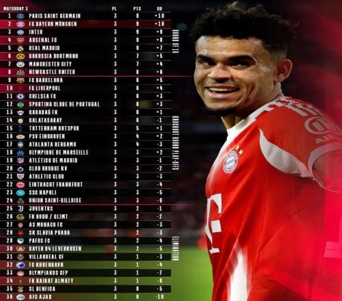 歐冠聯(lián)賽階段前3輪過后,拜仁三戰(zhàn)全勝,打進(jìn)12球丟2球,僅因進(jìn)球數(shù)的劣勢暫列第二。目前排名第一的則是同樣三戰(zhàn)全勝,打進(jìn)13球丟3球的巴黎。